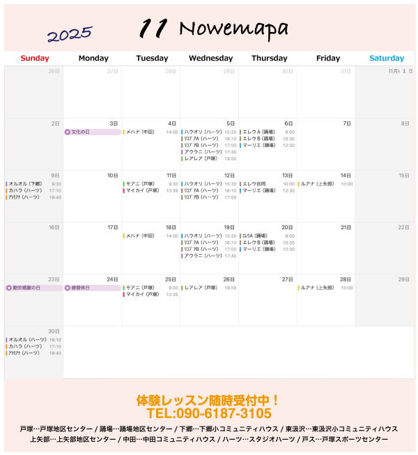 | カハラ 日曜 17:10-18:40 月2回(計180分)お月謝4,500円[税込] |