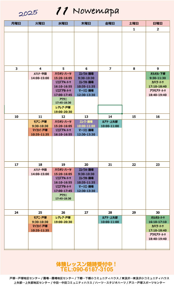 | カハラ 日曜 17:10-18:40 月2回(計180分)お月謝4,500円[税込] |