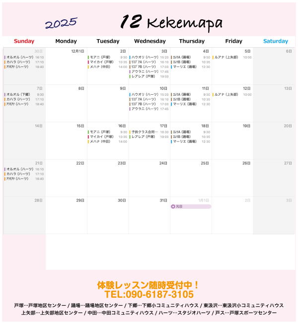 | カハラ 日曜 17:10-18:40 月2回(計180分)お月謝4,500円[税込] |