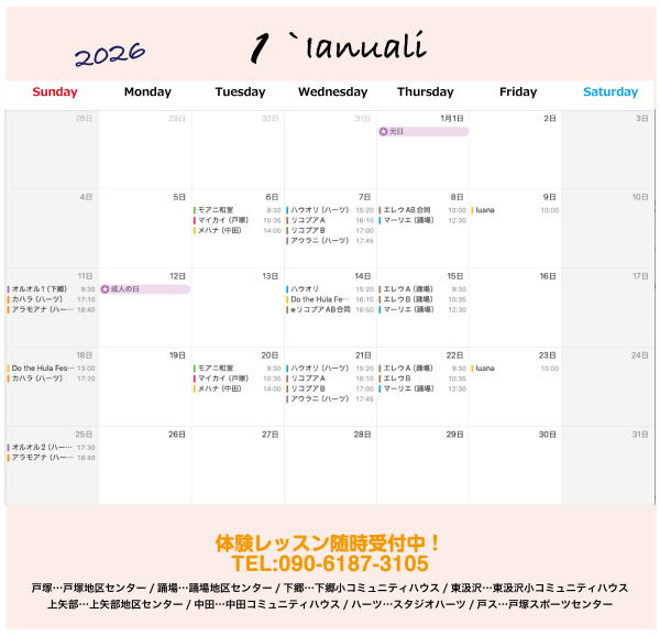 | アラモアナ ※NEW! 日曜 18:40-19:40 月2回(計120分)お月謝3,000円[税込] |